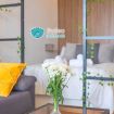 Un espacio diáfano amplio con una cama de matrimonio y un sofá-cama doble.
