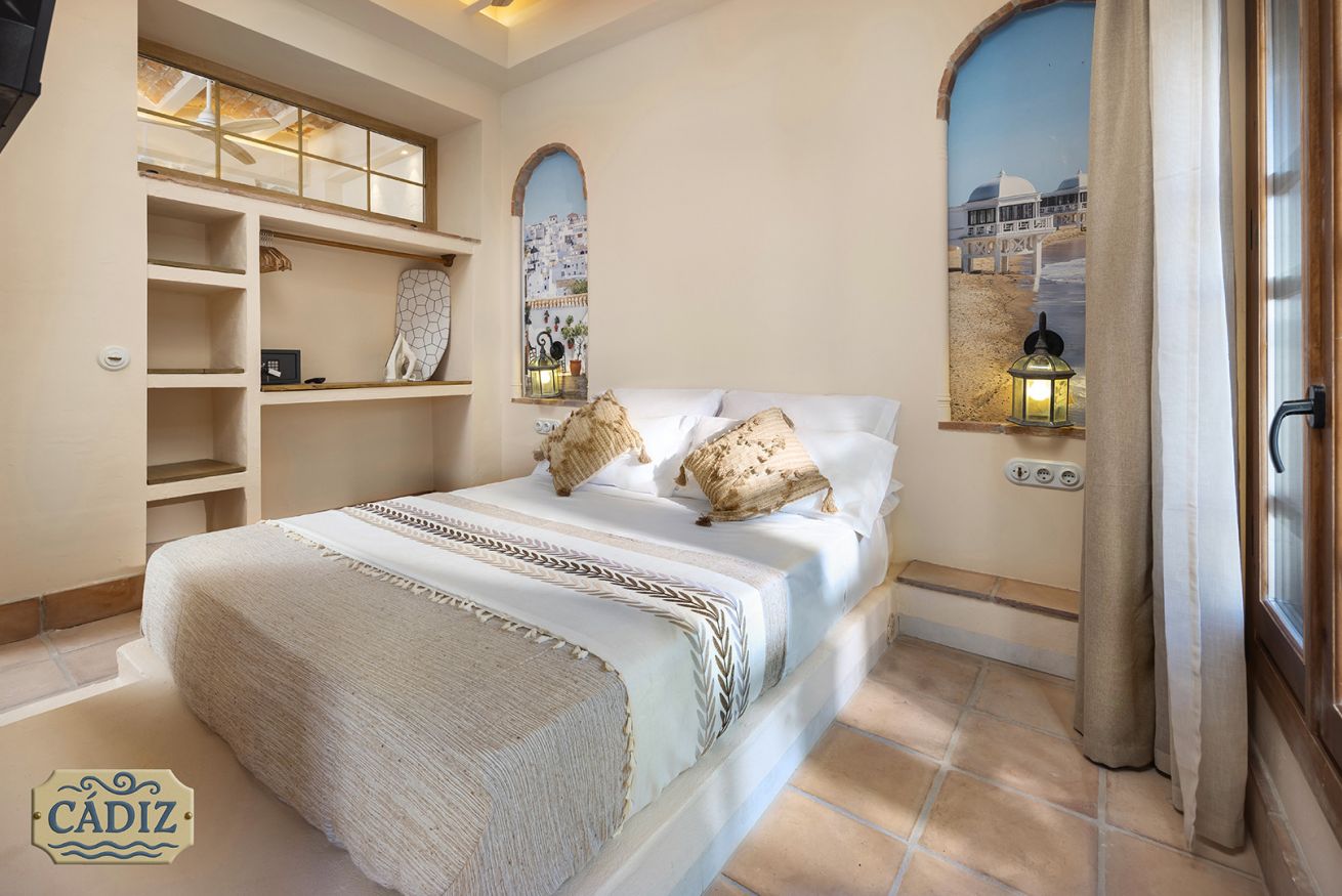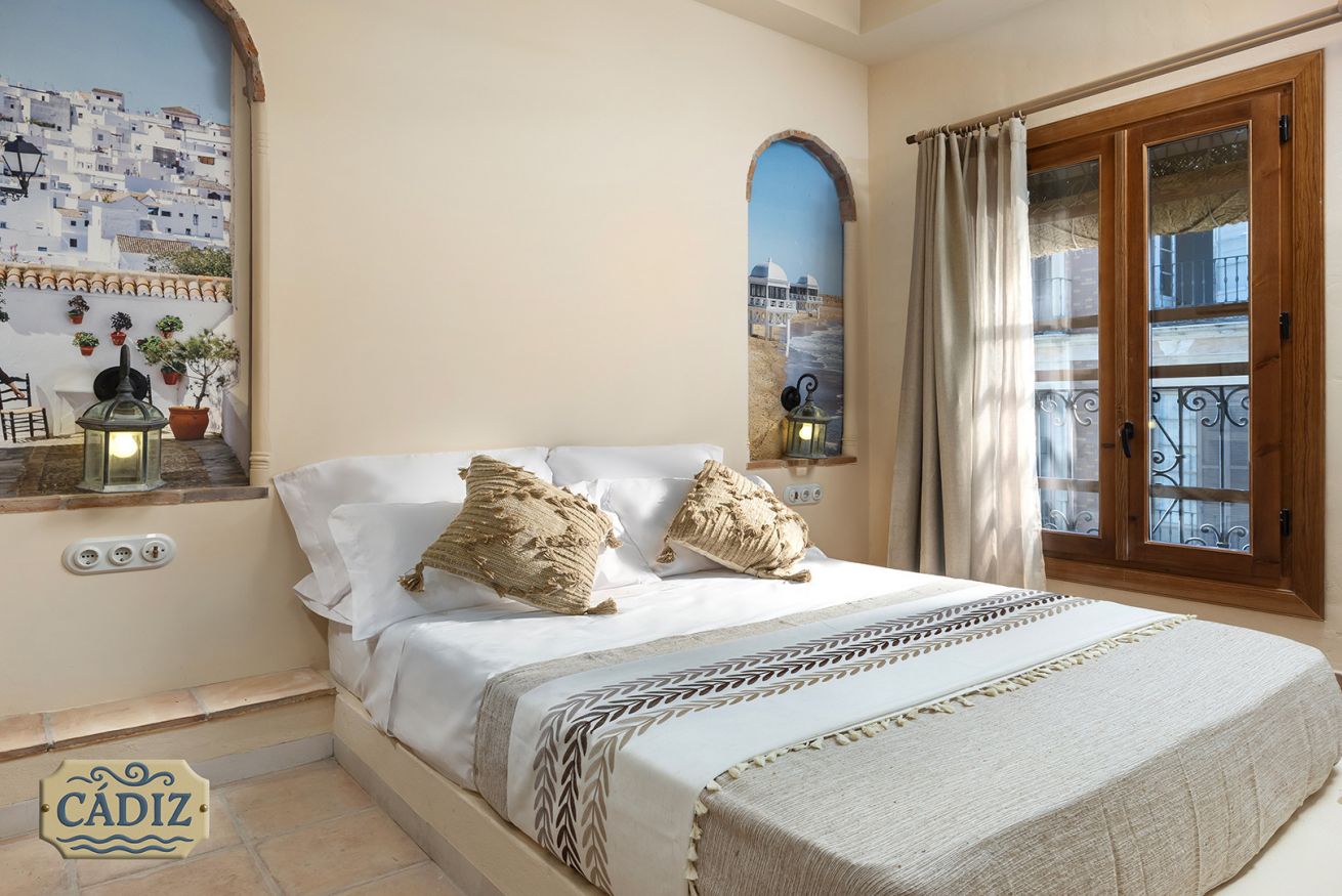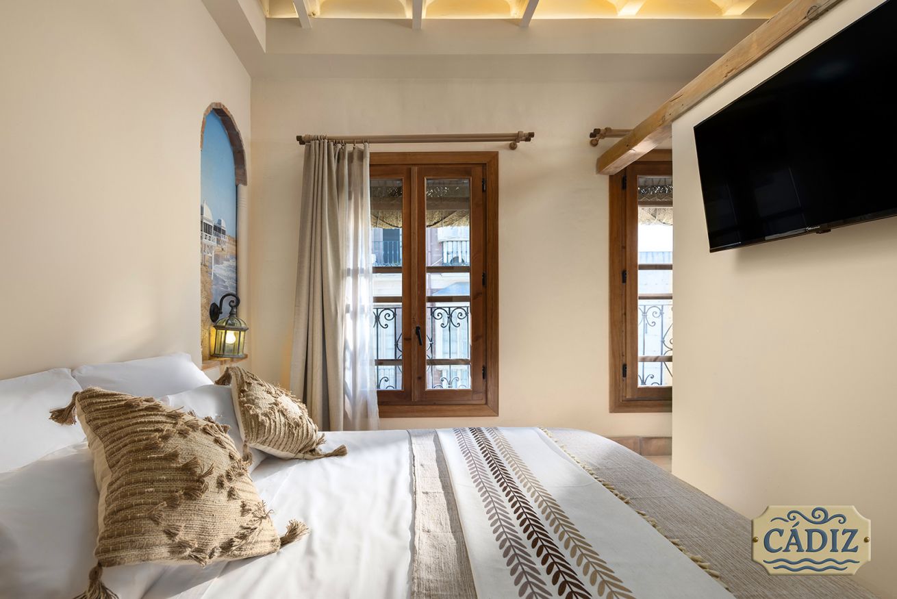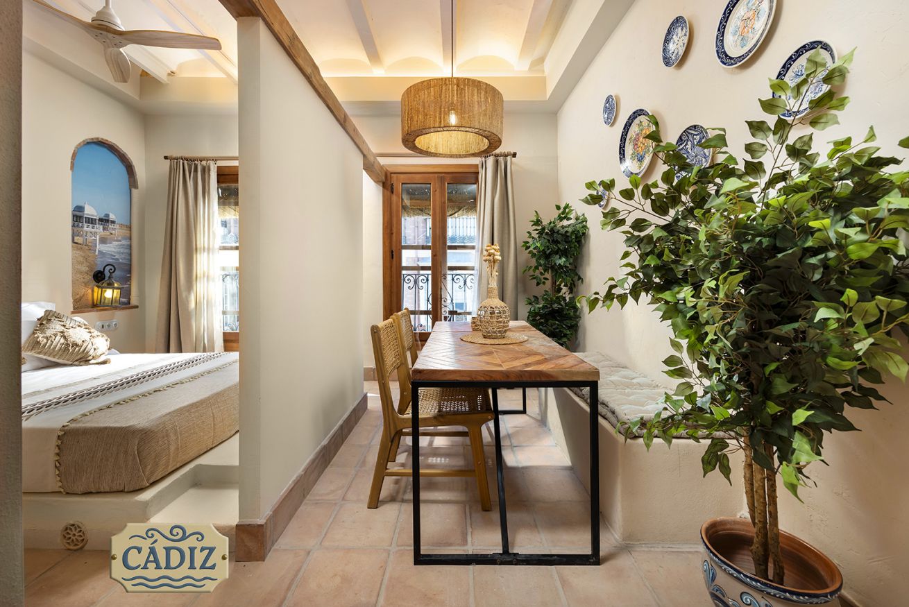 This exterior apartment, ideal for 4 guests, is inspired by the light, coastline, and southern breeze of Cádiz. Its design pays tribute to the city’s white architecture, open patios, and subtle maritime touches reminiscent of the Bay of Cádiz. Bright, fresh, and relaxing, the space includes a cozy bedroom, private bathroom, fully equipped kitchen, and a dining area for your comfort.